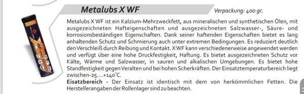 Das auf Kalzium basierende Mehrzweckfett X WF besteht aus Mineral- und Syntheseölen und verfügt über hervorragende Hafteigenschaften sowie Beständigkeit gegenüber Salzwasser sowie sauren und alkalischen Umgebungen. Es ist beständig gegen das Auswaschen von Lagern und zu fettenden Bauteilen und gewährleistet so auch unter extremen Bedingungen eine gute Funktion. Reduziert den Reibungsverschleiß der Kontaktflächen erheblich. Es ist universell einsetzbar, hochdruckbeständig, haftfest, bietet sicheren Korrosionsschutz, ist beständig gegen Kalt- und Warmwasser, Salz, Säuren, Basen, verhindert Rostbildung an Armaturen, bietet Stabilität gegen Korrosion, Alterung und Schneiden, pump- und übertragungsfähig, für den Einsatz im Temperaturbereich von -25°C bis +140°C.